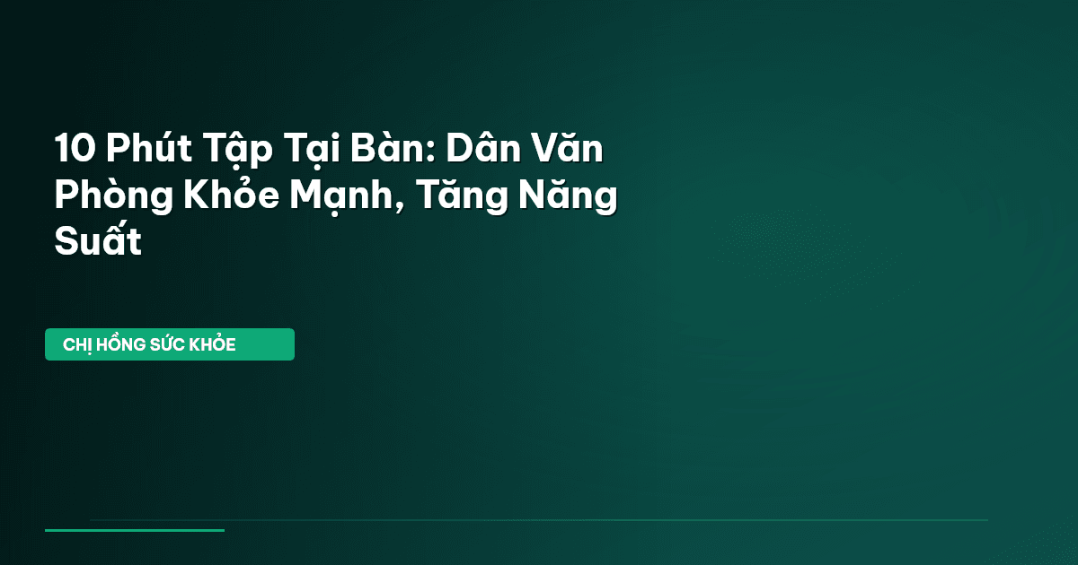 ⏱️ 10 phút đọc · 1943 từ Giới Thiệu: 10 Phút Vàng Cho Sức Khỏe Dân Văn Phòng Bạn có biết, phần lớn người trưởng thành ở Việt Nam dành hơn 8 giờ mỗi ngày để ngồi làm việc? Nghe thì có vẻ bình thường, nhưng việc ngồi lâu liên tục như vậy lại là một trong những 'kẻ thù thầm lặng' của sức khỏe dân văn phòng đấy! Chị Hồng biết rất nhiều bạn gái và anh trai làm văn phòng than phiền về tình trạng đau mỏi vai gáy, đau lưng dưới, tê bì chân tay hay thậm chí là căng thẳng, uể oải dù chẳng làm gì nặng nhọc…