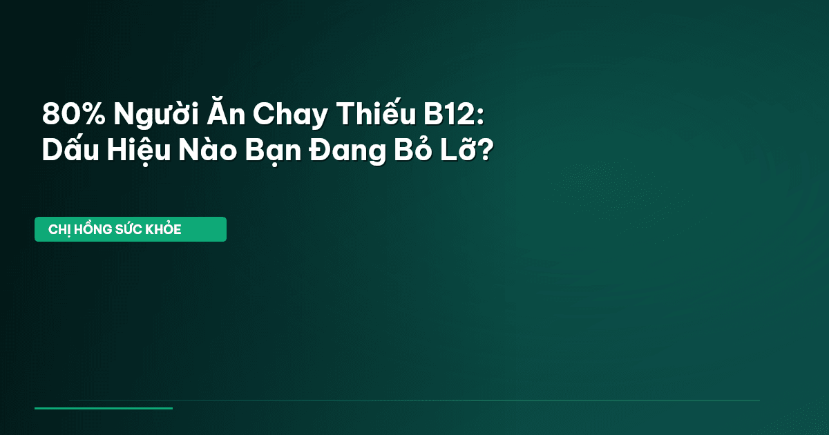 ⏱️ 13 phút đọc · 2590 từ Giới Thiệu: Vitamin B12 – Vị Khách Vô Hình Của Người Ăn Chay Bạn có biết, theo nhiều nghiên cứu, có tới 80% người ăn chay trường và khoảng 40% người ăn chay bán phần có nguy cơ thiếu vitamin B12 ? Đây là một con số đáng báo động, đặc biệt khi xu hướng ăn chay đang ngày càng phổ biến tại Việt Nam. Nhiều chị em lựa chọn chế độ ăn thuần thực vật vì sức khỏe, vì môi trường hay vì lòng từ bi. Tuy nhiên, nếu không tìm hiểu kỹ, chúng ta rất dễ vô tình bỏ qua một dưỡng chất cực …