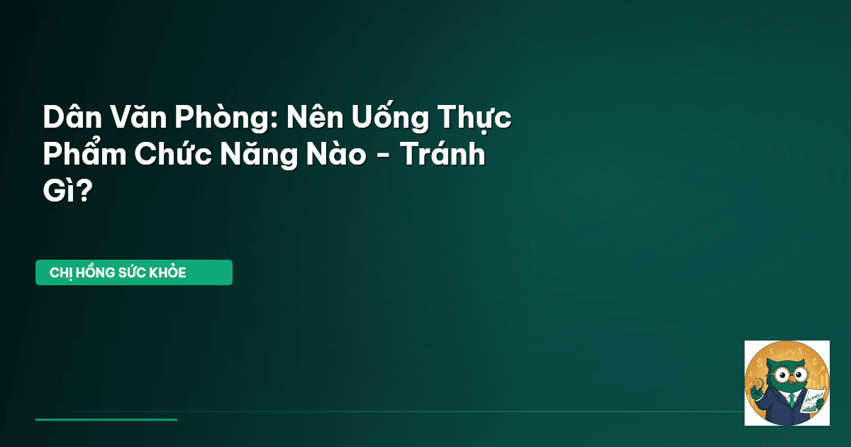 ⏱️ 9 phút đọc · 1691 từ Giới Thiệu: Đừng Để 'Bệnh Văn Phòng' Biến Thành 'Bệnh Nặng' Chào cả nhà Cú Thông Thái! Chị Hồng biết, cuộc sống văn phòng bận rộn thường khiến chúng ta phải đối mặt với nhiều vấn đề sức khỏe. Từ những buổi họp căng thẳng, những đêm deadline kéo dài, đến việc ngồi lì hàng giờ trước máy tính... Tất cả đều có thể làm cơ thể mệt mỏi, thiếu chất, thậm chí là "bệnh văn phòng" như đau vai gáy, mắt kém, khó ngủ. Giữa bộn bề thông tin và quảng cáo, thực phẩm chức năng (TPCN) bỗng …