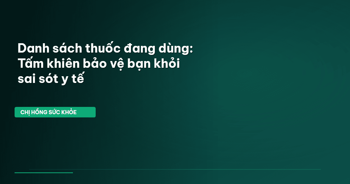 ⏱️ 9 phút đọc · 1787 từ Giới Thiệu: Vì sao danh sách thuốc đang dùng lại quan trọng đến thế? Bạn có biết, trên toàn cầu, hàng triệu người phải chịu ảnh hưởng từ các sai sót liên quan đến thuốc mỗi năm, từ nhẹ như khó chịu đến nghiêm trọng như nguy hiểm tính mạng? Ngay tại Việt Nam, vấn đề quản lý thuốc men cũng đang trở thành nỗi lo của rất nhiều gia đình, đặc biệt là những người lớn tuổi hay người có nhiều bệnh nền phải dùng thuốc thường xuyên. Đừng để bạn hay người thân là một phần trong con s…